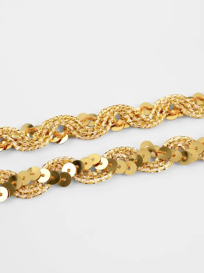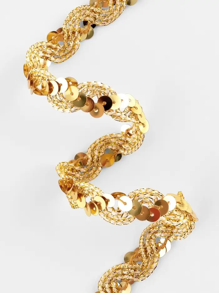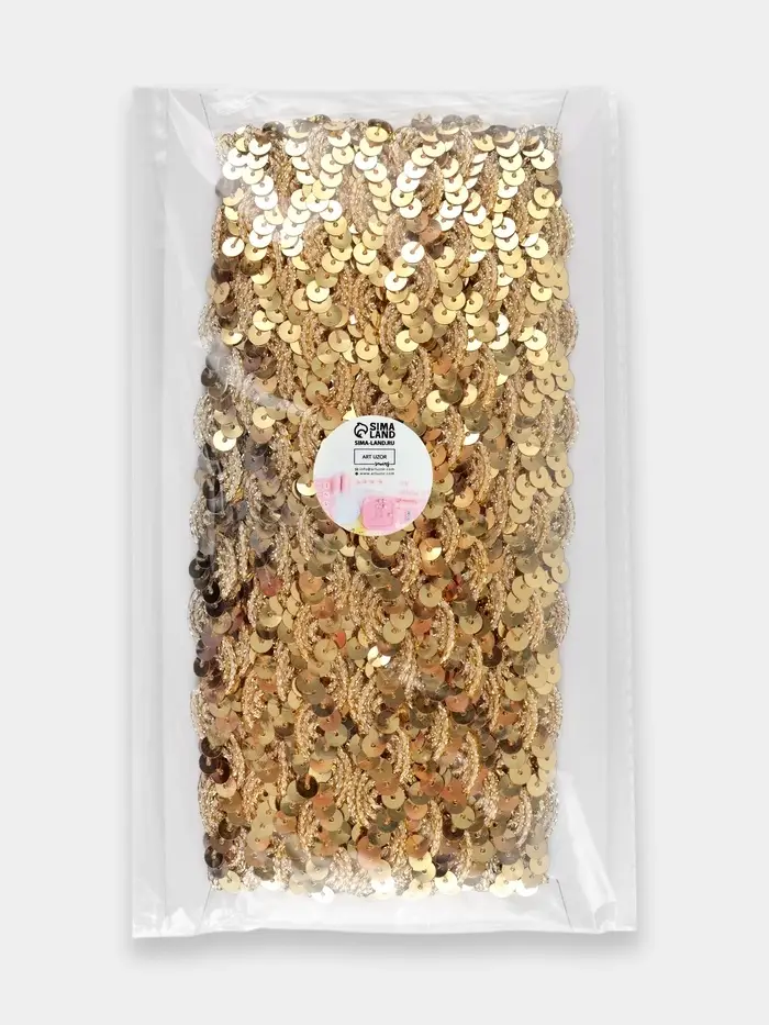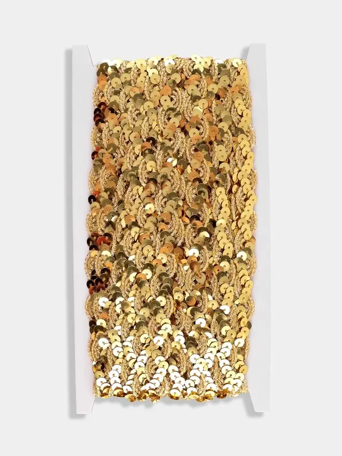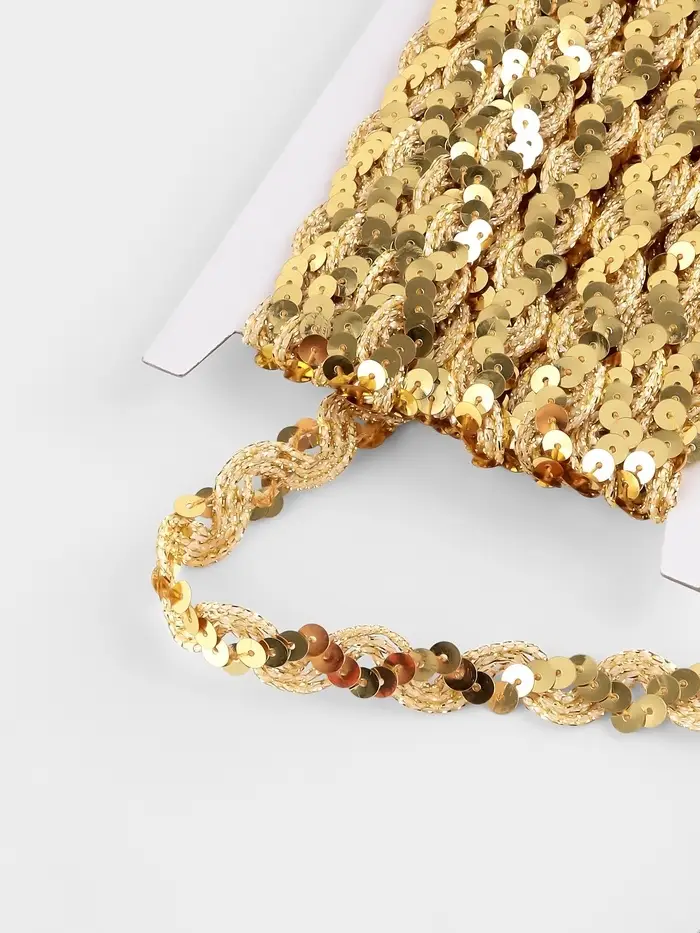 Золотая пайеточная тесьма придаёт женским проектам тёплое мерцание. Узкий формат создаёт изящные блестящие линии, подчёркивающие изгибы без излишней тяжести. Девяти метров хватит для отделки нарядов, аксессуаров или небольших декоративных элементов.