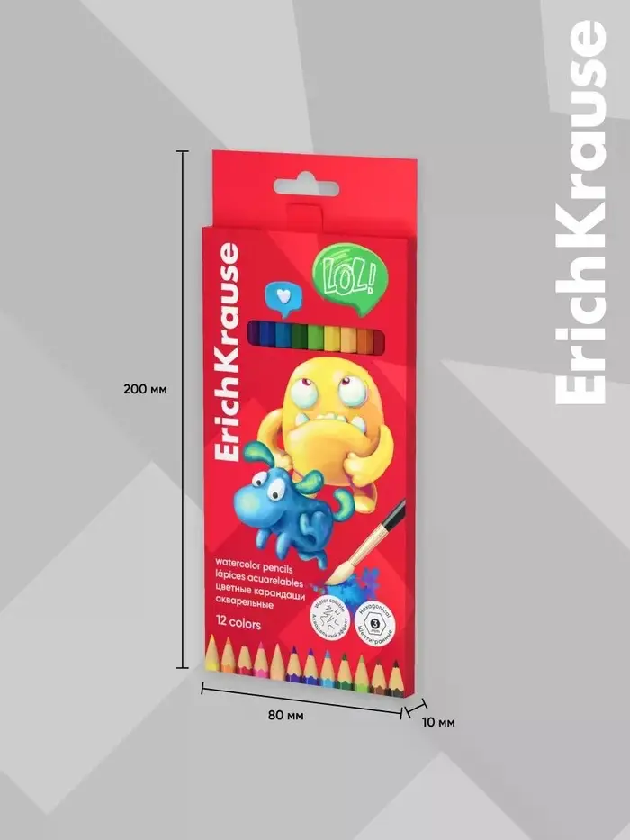 Карандаши акварельные 12 цветов ErichKrause Jolly Friends, дерево, шестигранные с кисточкой, европодвес