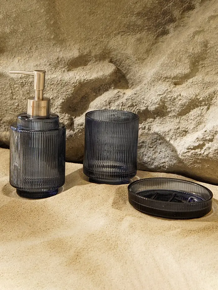 Выполненные из высококачественного стекла, элементы набора привлекают внимание своим гармоничным сочетанием синего и прозрачного цветов. Их лаконичный однотонный дизайн без рисунков позволяет легко интегрировать их в любое оформление ванной комнаты, создавая атмосферу порядка и спокойствия.