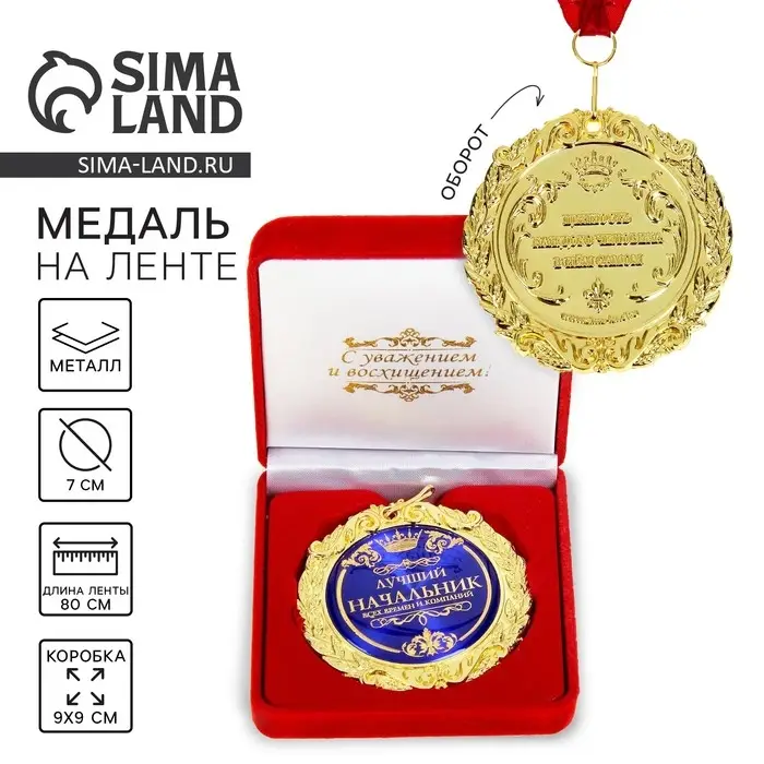 Создана формула идеального поздравления: классическая форма и праздничное содержание. Именно такой и является медаль в бархатной коробке «Лучший начальник», d=7 см. Это отличная награда для самых достойных представителей своего времени. Эксклюзивный сувенир станет достойным украшением вечера и поможет создать незабываемую церемонию поздравления.