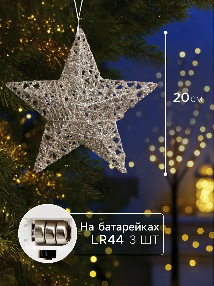 Комбинация металла и пластика обеспечивает лёгкость и прочность конструкции, а питание от трёх батареек AG13 (LR44) гарантирует автономность и удобство использования без необходимости подключения к электросети. Такая подвеска станет универсальным элементом декора для дома, офиса или торговых площадок в новогодний сезон.