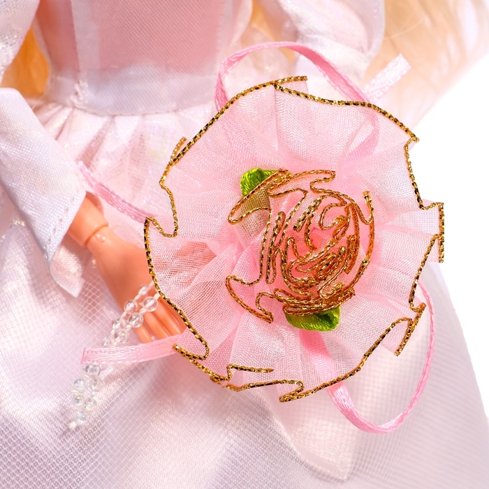 - Свадебный образ: Кукла одета в белоснежное платье. Длинные светлые волосы дополнены белой фатой. Тонкие украшения и нежно-розовый букет цветов придают образу особый шарм.