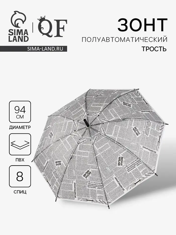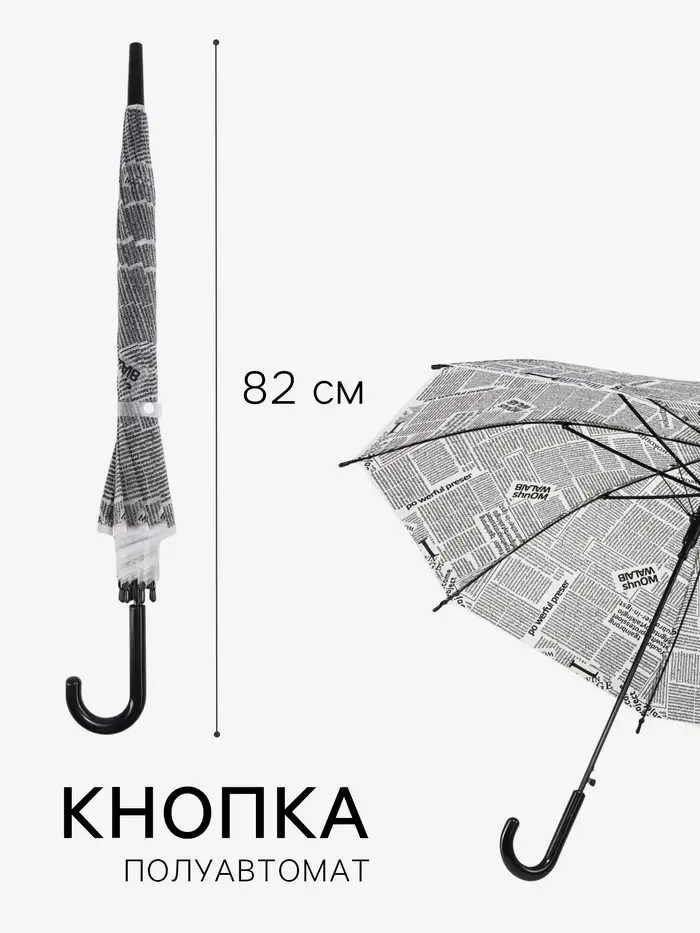Зонт - трость полуавтоматический «Газета», 8 спиц, R=47/54 см, d=94 см, серый