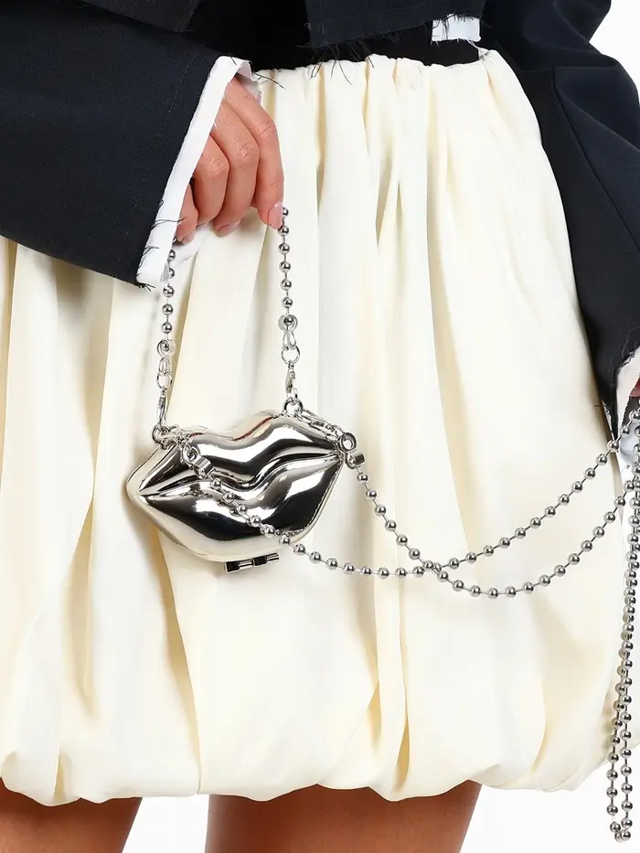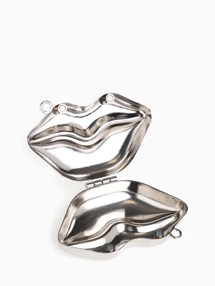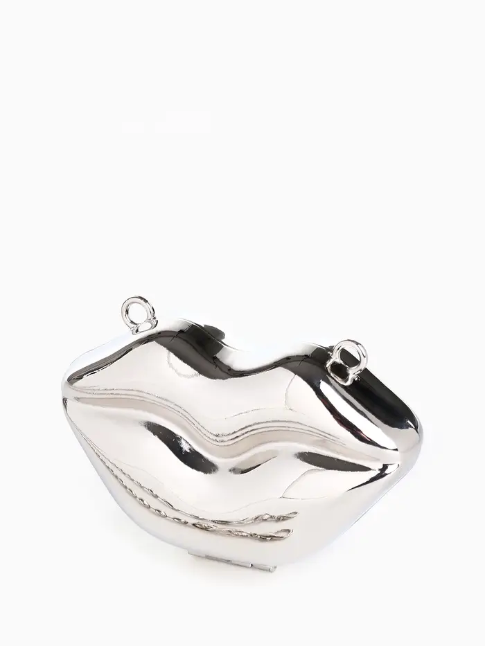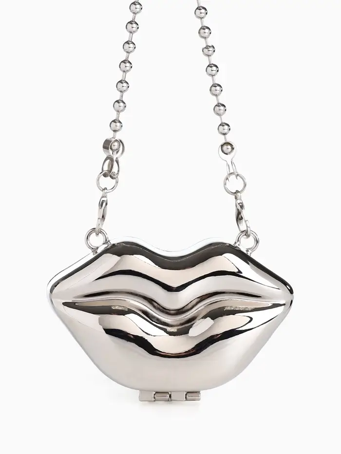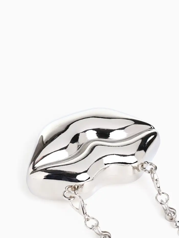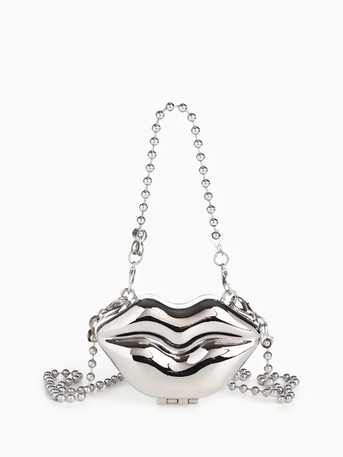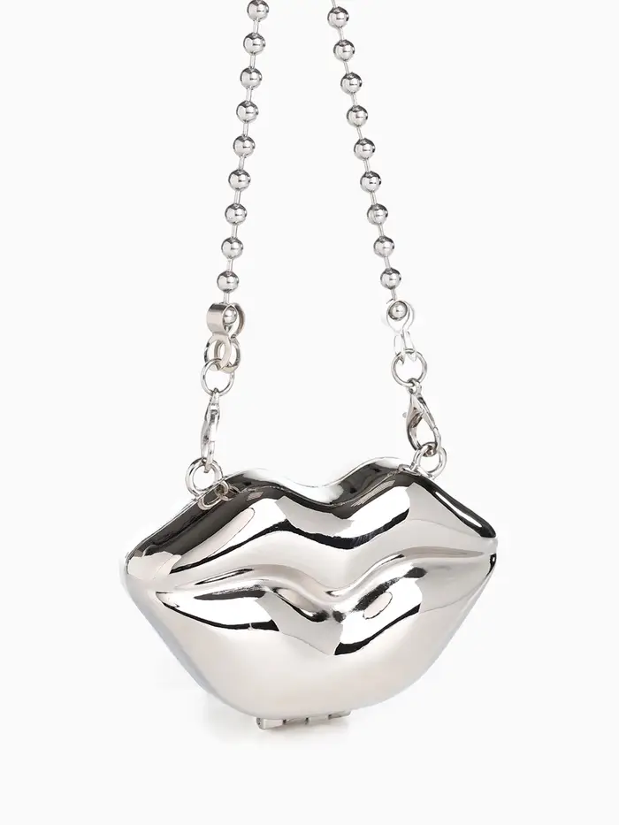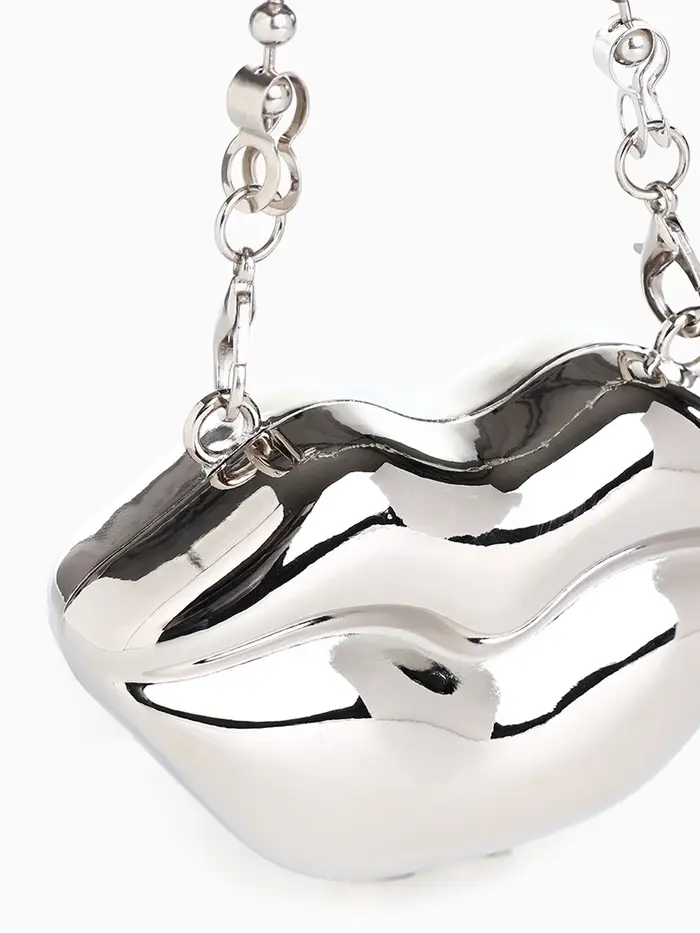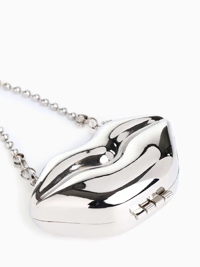 Сумка мини-клатч на магните, в форме губ, жёсткий корпус, на длинной цепочке, серебристая