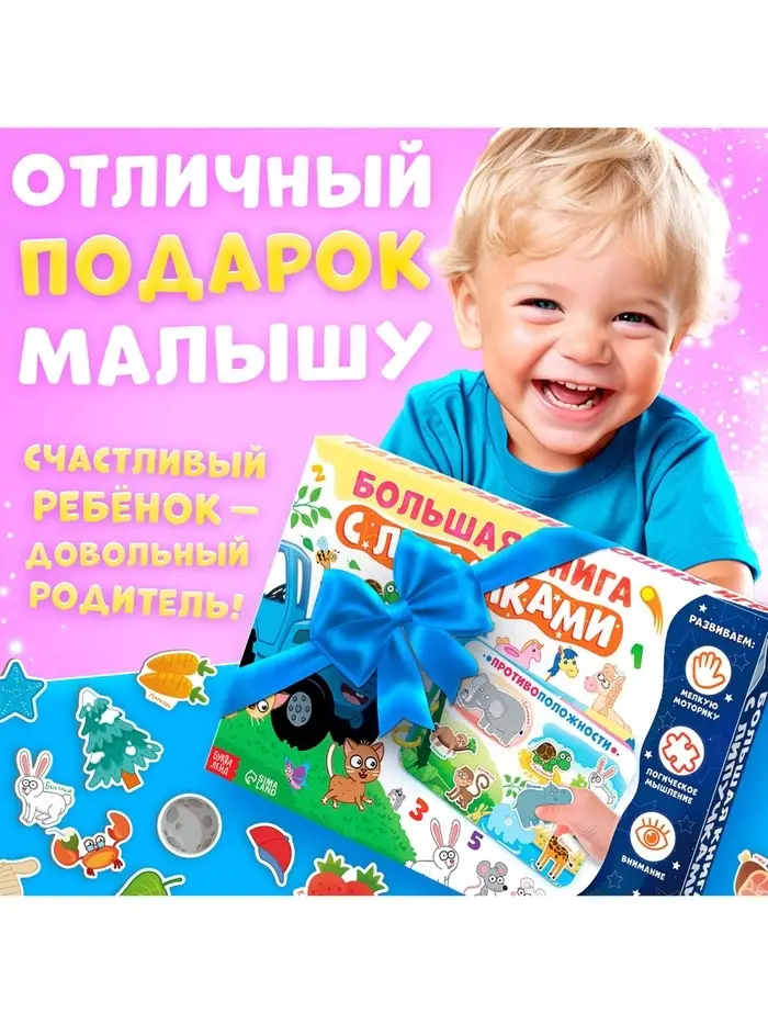 С помощью книги ребёнок постепенно знакомится с базовыми понятиями. Игры с липучками развивают мелкую моторику и учат концентрироваться. Это отличное начало для первых шагов в мир обучения!