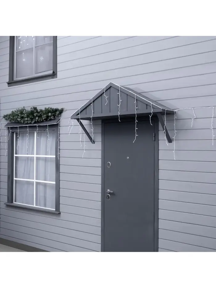 Белая светодиодная бахрома длиной 6 метров создаёт аккуратный и выразительный контур освещения, подчёркивая архитектуру дома или уличного пространства. Вертикальные нити формируют эффект «светового водопада», а ровное белое свечение выглядит чисто и современно, добавляя оформлению завершённость и визуальный порядок.
