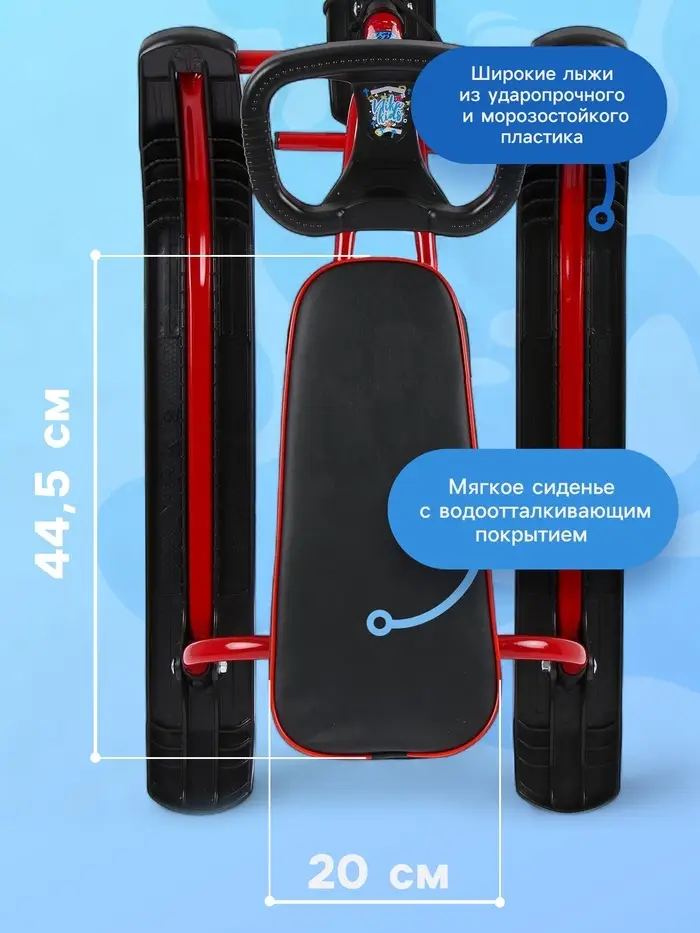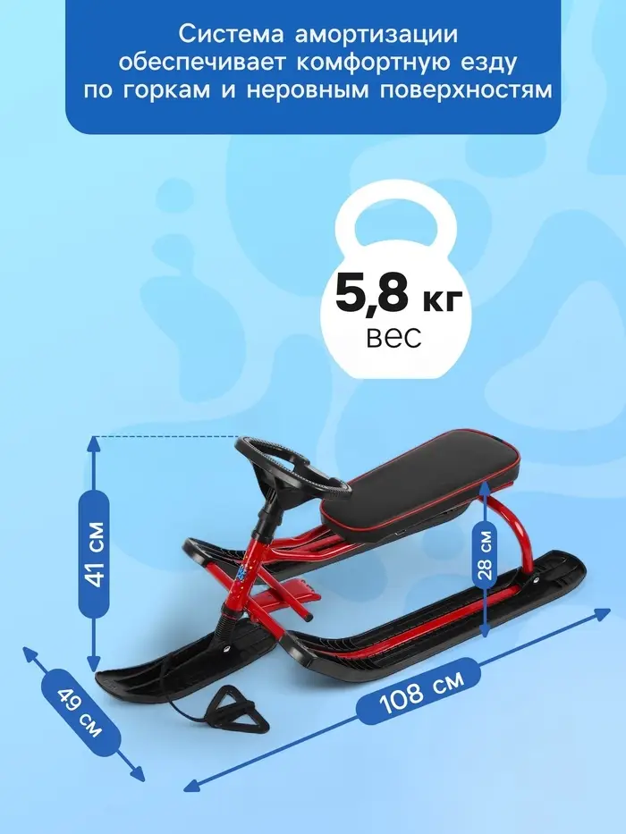 Снегокат предназначен для перевозки детей по плотному снегу или льду, катанию с горок. Имеет сварную конструкцию из стальных труб, пластиковых элементов и мягкое сиденье, обтянутое искусственной кожей. Оснащён буксировочным тросом. Тормоз эффективен на обледенелой поверхности.