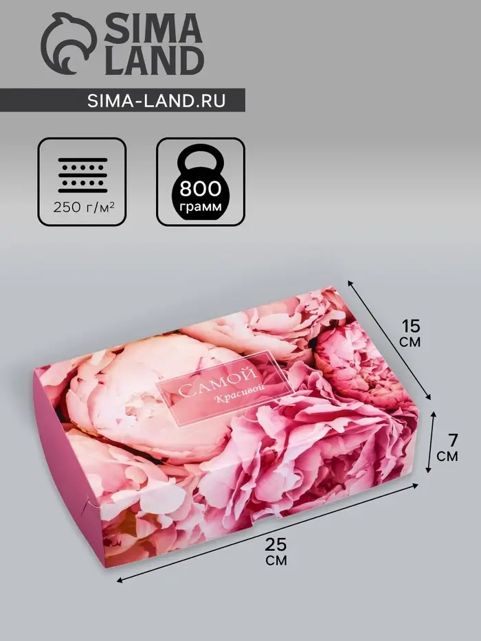 - Размер коробки составляет 25х15х7 см, что позволяет разместить внутри разнообразные кондитерские изделия: от небольших шоколадок до крупных конфет и даже пирожных.