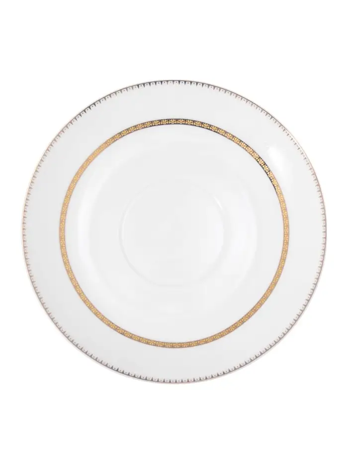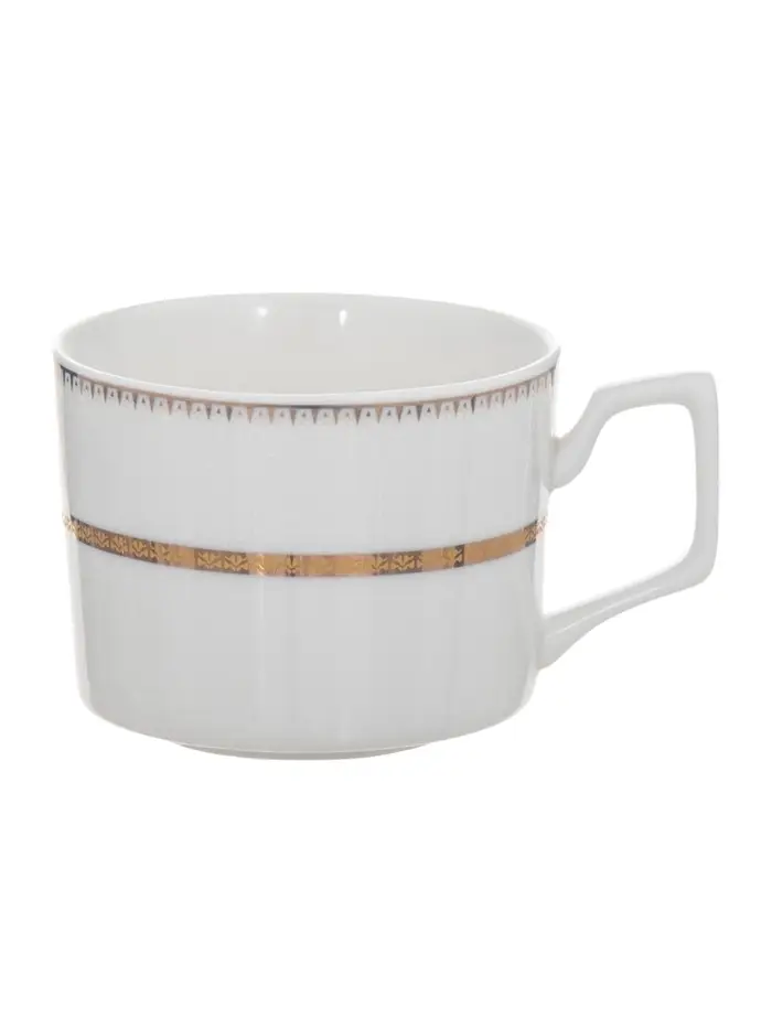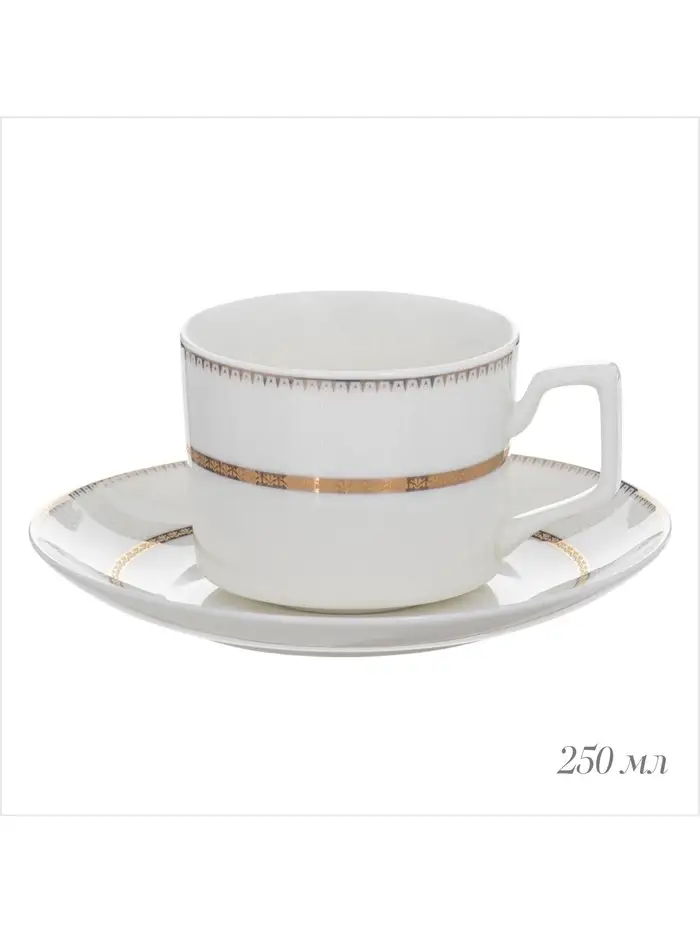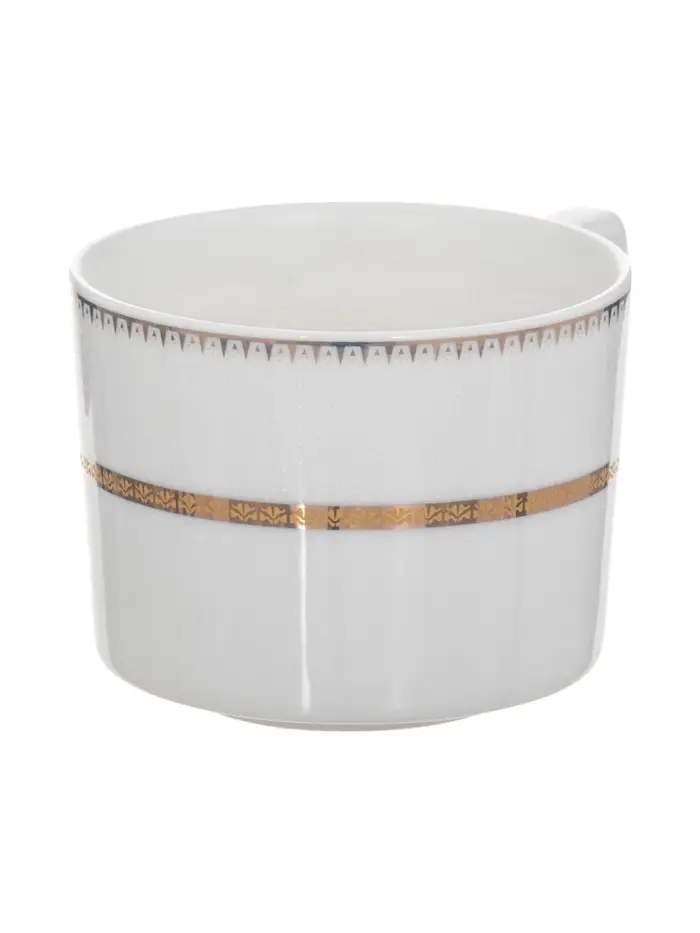 Сервиз состоит из шести элегантных кружек объемом 250 мл и шести соответствующих блюдец диаметром 15,5 см. Белоснежная основа сервиза и тонкая золотая окантовка создают нежный и роскошный образ, делая каждое чаепитие особенным.