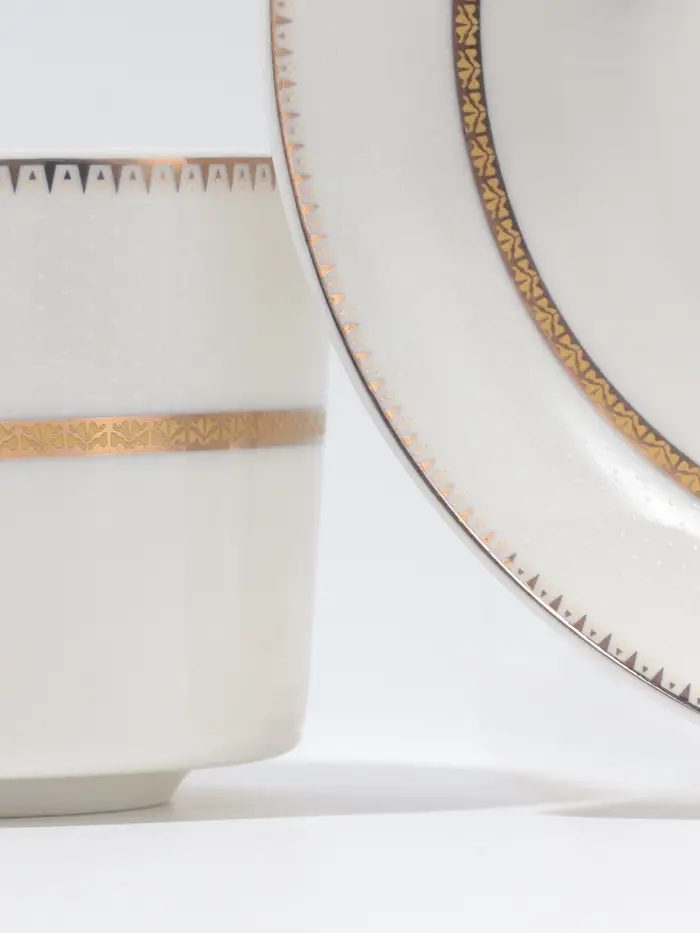 - Изысканный стиль: белый фарфор с золотой отводкой создают атмосферу элегантности и классического стиля.
