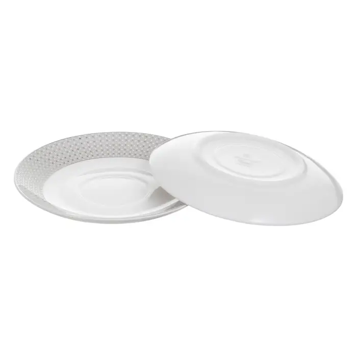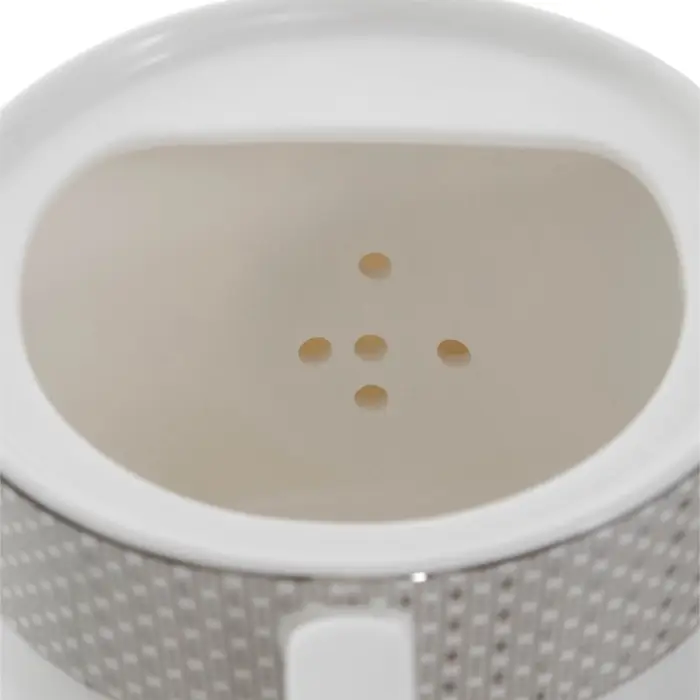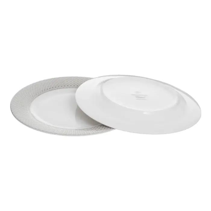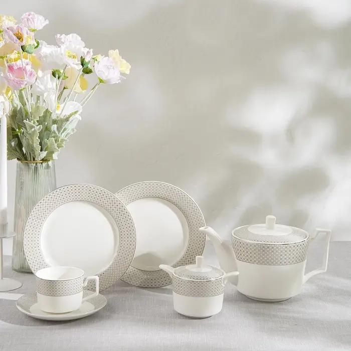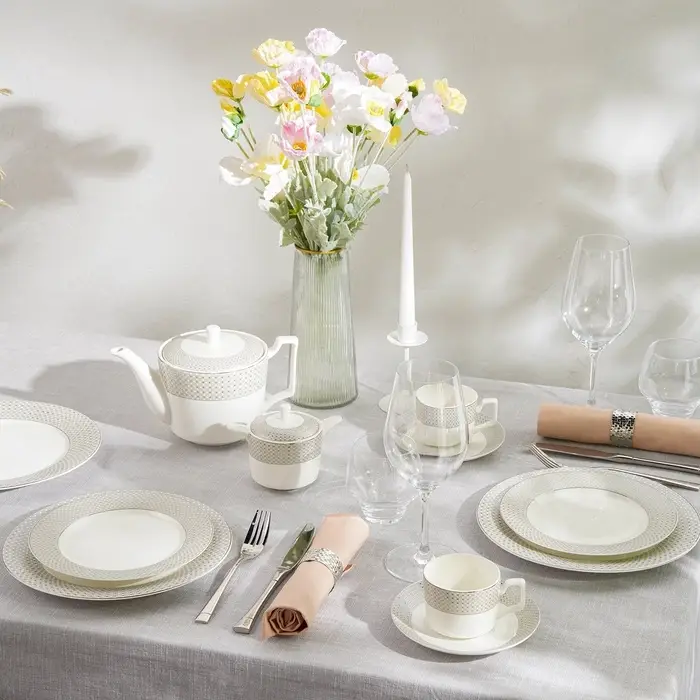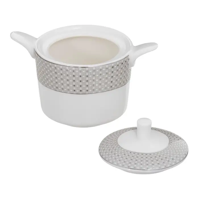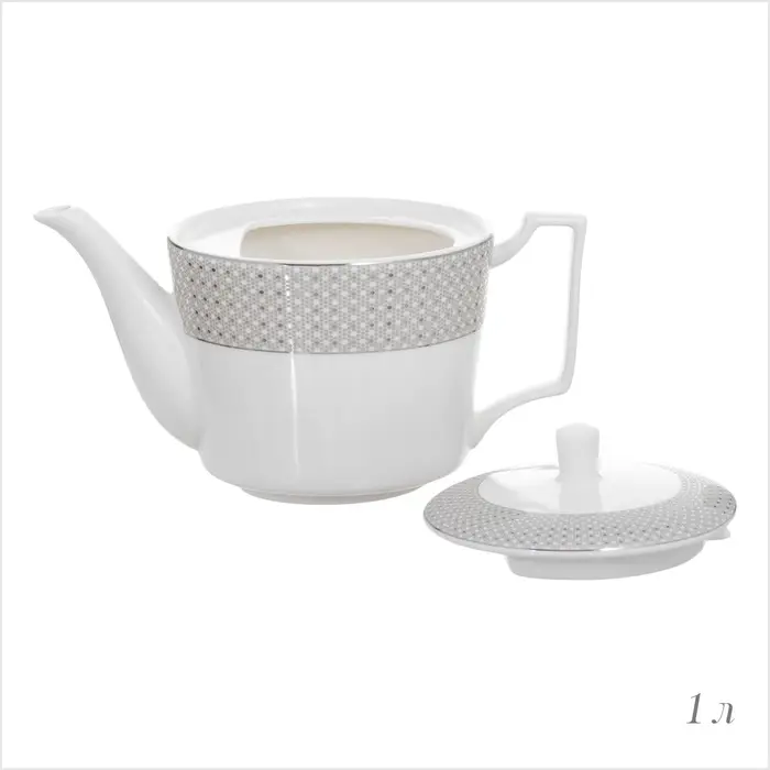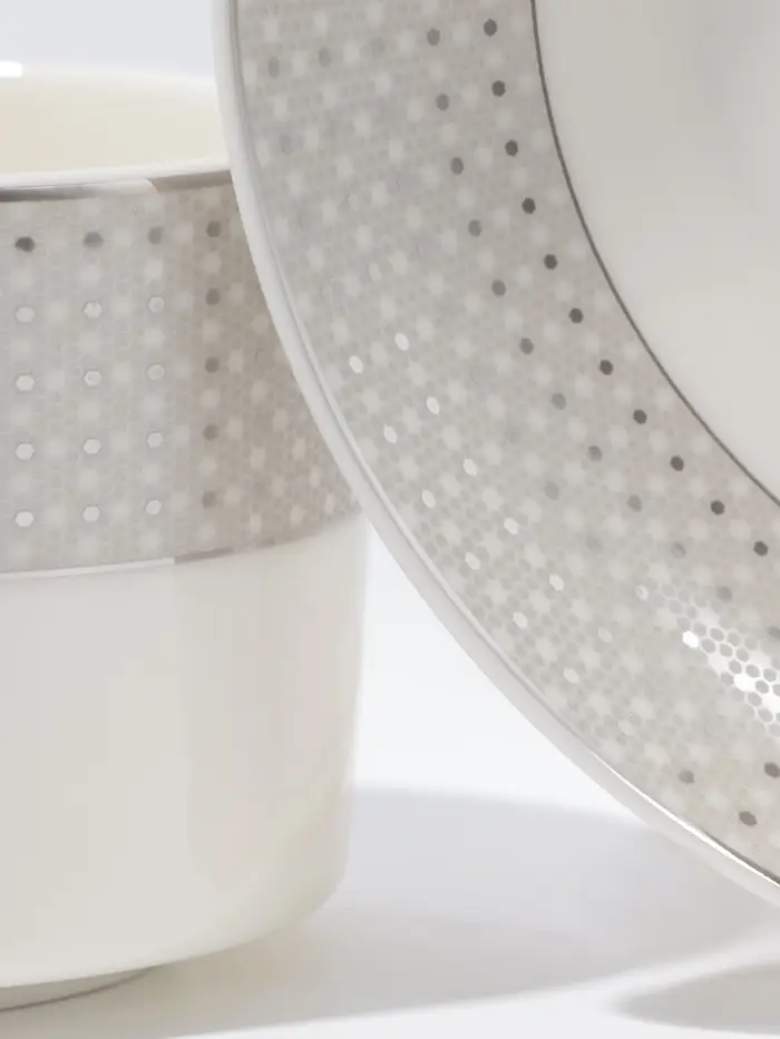 - Элегантный дизайн: белоснежный фарфор с тонкой серебряной отделкой.