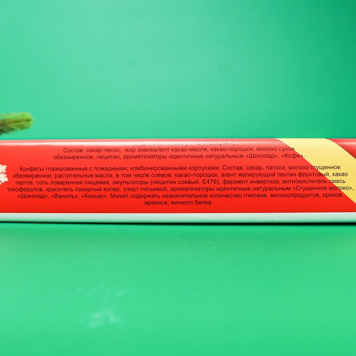 - конфеты глазированные с помадными комбинированными корпусами. Состав: сахар, патока, молоко сгущённое обезжиренное, растительные масла, в том числе соевое, какао-порошок, агент желирующий пектин фруктовый, какао тертое, соль поваренная пищевая, эмульгаторы (лецитин соевый, Е476), фермент инвертаза, антиокислитель смесь токоферолов, краситель сахарный колер, спирт питьевой, ароматизаторы идентичные натуральным «сгущённое молоко», «шоколад», «ваниль», «коньяк». Может содержать незначительное количество глютена, молокопродуктов, орехов, арахиса, яичного белка.