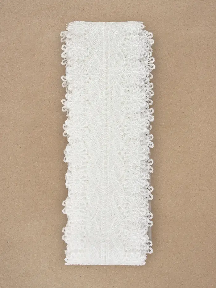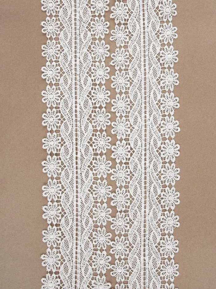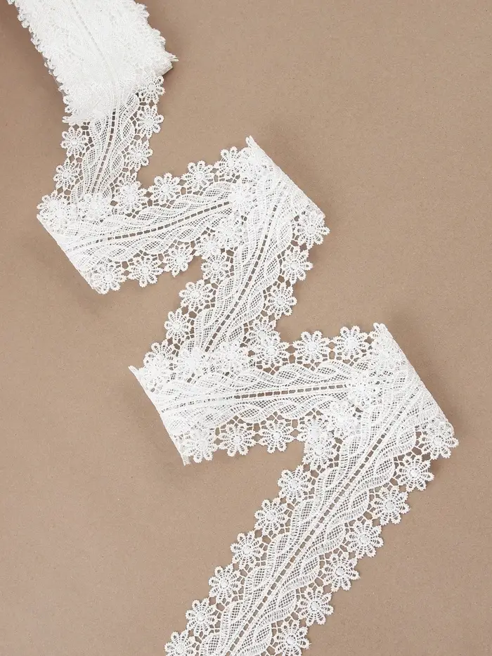 Откройте новые грани творчества с этим изящным 80-миллиметровым кружевом! Сочетание полиэстера и гипюрового плетения придает ткани уникальную текстуру и облегчает её интеграцию в любые модные и дизайнерские проекты. Его длина, 6,8 метра, позволяет вам воплотить множество идей — от одежды до украшений интерьера.