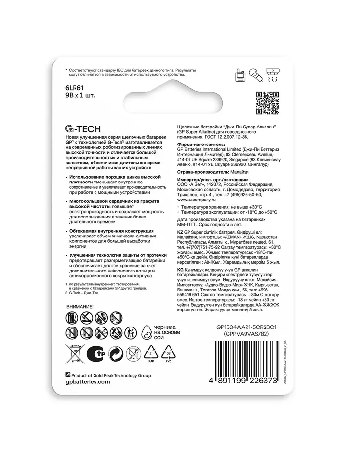 Все батарейки торговой марки GP сертифицированы согласно российскому стандарту ГОСТ и международным стандартам ISO9001 и ISO14001.