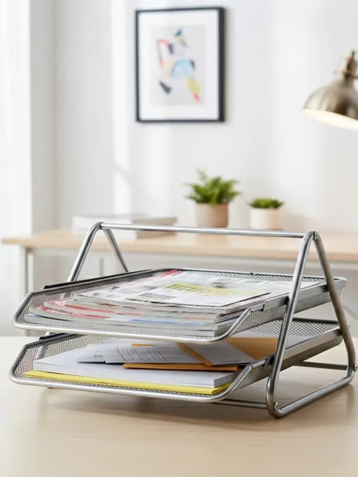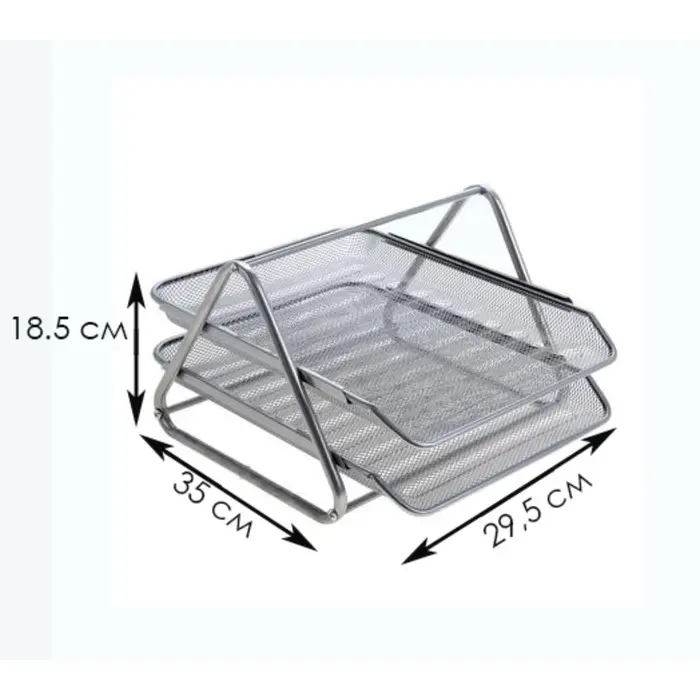 Создайте чёткое разделение для ваших документов с минималистичным акцентом на столе. Этот горизонтальный лоток из серой металлической сетки с двумя отделениями предлагает лёгкость конструкции и прочность материала. Он помогает интуитивно сортировать бумаги на две основные категории, сохраняя рабочий стол организованным и визуально лёгким.