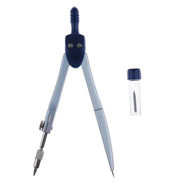 - В набор входят два предмета: металлический циркуль диаметром 130 мм и упаковка запасных грифелей.