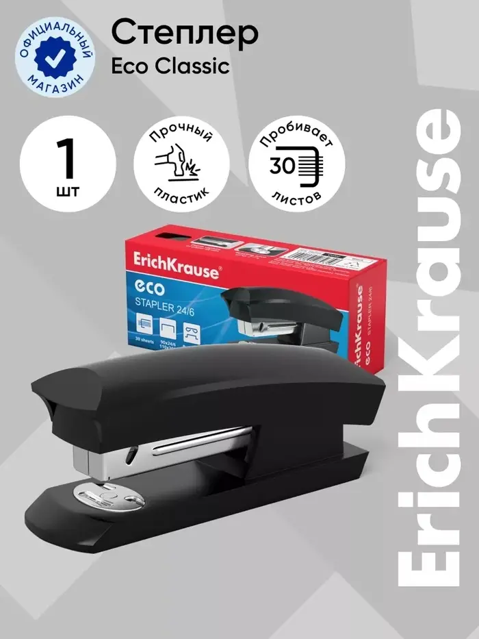 Степлер канцелярский № 24/6, 26/6, ErichKrause ECO, металлический корпус, до 30 листов, чёрный