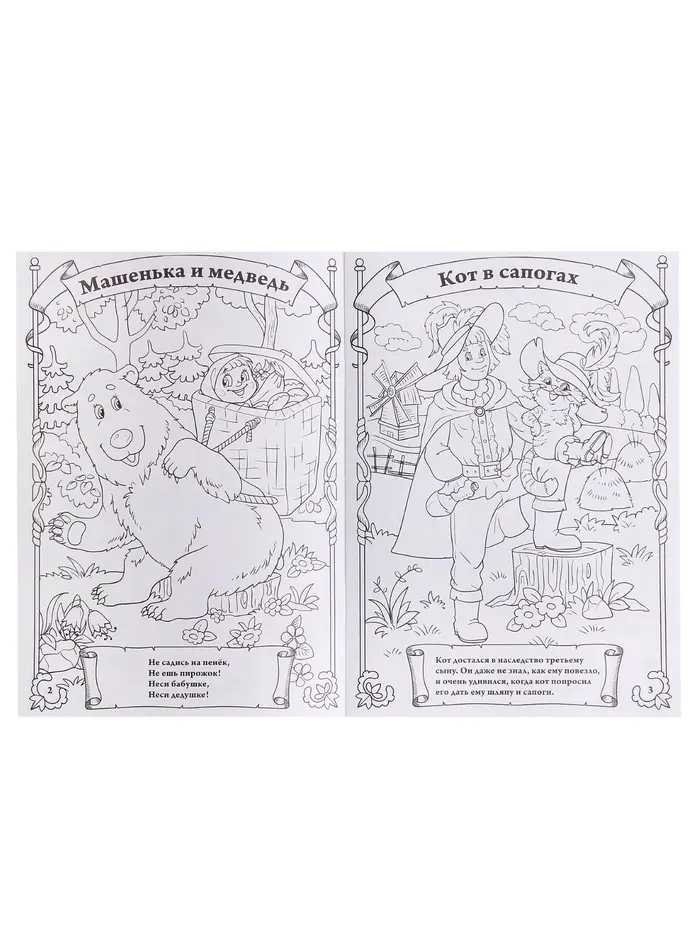 - Каждая страница содержит сцену из сказки и отрывок текста.