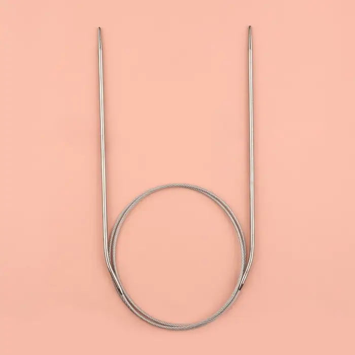 Круговые спицы представляют собой две металлические части, соединённые друг с другом тросиком. Инструмент незаменим при вязании полотна по кругу. С его помощью получаются изделия без дополнительных швов: шапки, рукава и горловины.