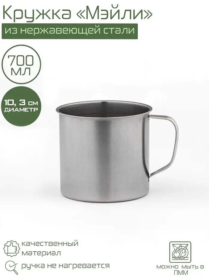 Объемная и прочная кружка для активного отдыха и дома. Металлическая кружка 700 мл из нержавеющей стали подходит для туризма и повседневного использования. Ее гладкая поверхность упрощает уход и сохраняет презентабельный вид.