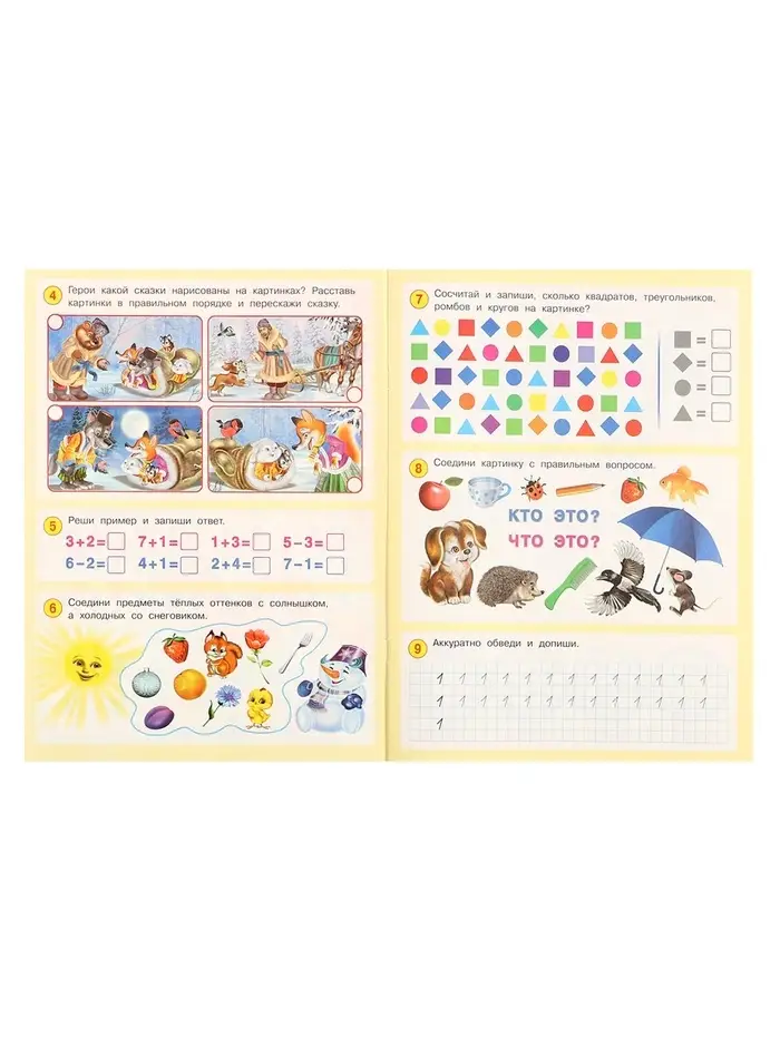 - Тематика охватывает буквы, цифры, сказки, время и логические задачи, формируя целостное представление об окружающем мире.