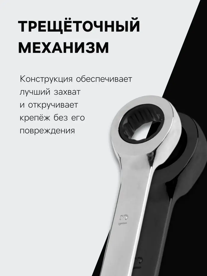 - Комбинированный тип: Открытый зев для быстрого накидывания на гайку. Кольцо с трещоткой для интенсивной работы без перехвата.
