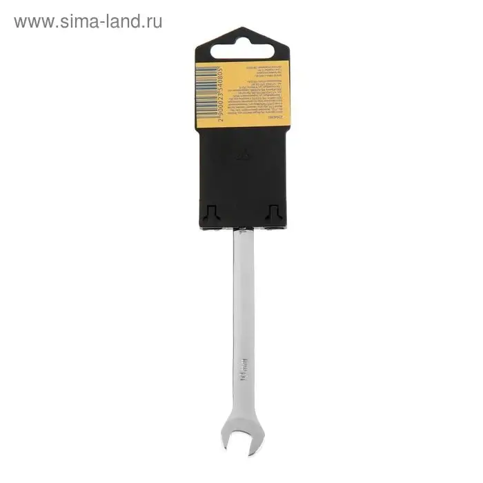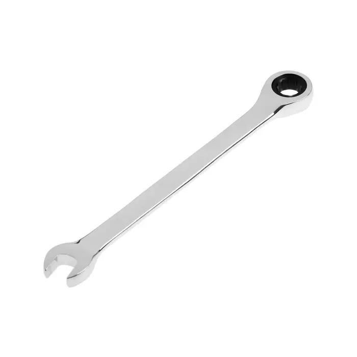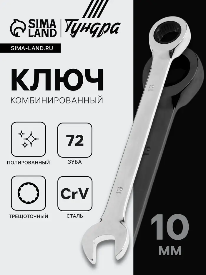 Комбинированный трещоточный ключ, 10 мм, 72 зуба, полированный — двусторонний инструмент для работы с крепежом. С одной стороны — открытый зев, с другой — кольцо с трещоткой. Механизм с 72 зубьями требует поворота всего на 5° для следующего щелчка. Изготовлен из хромованадиевой стали (CrV) с полированным покрытием.