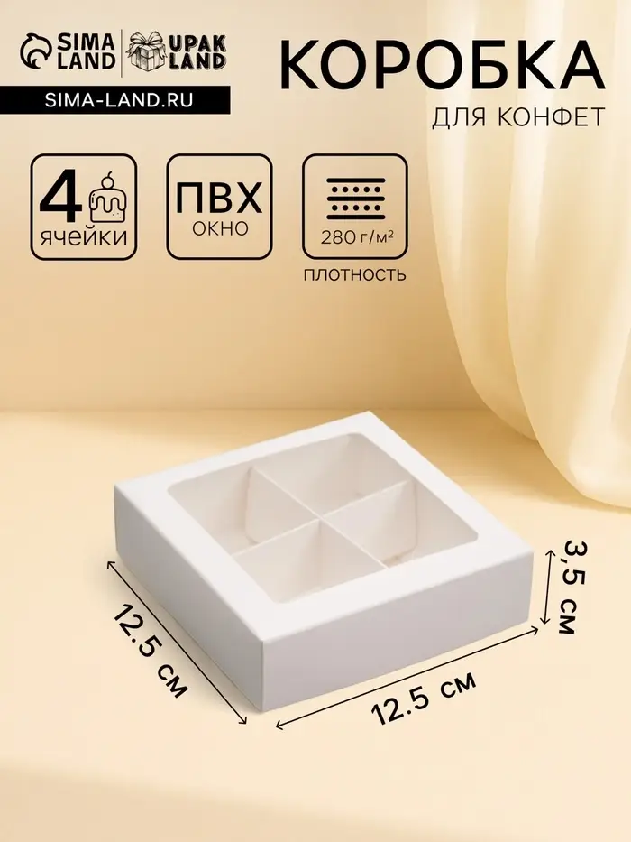 - Размер 12.5×12.5×3.5 см: Компактная квадратная коробка с высотой 3.5 см идеально подходит для набора из четырёх конфет стандартного размера. Упаковка не выглядит слишком большой или пустой.