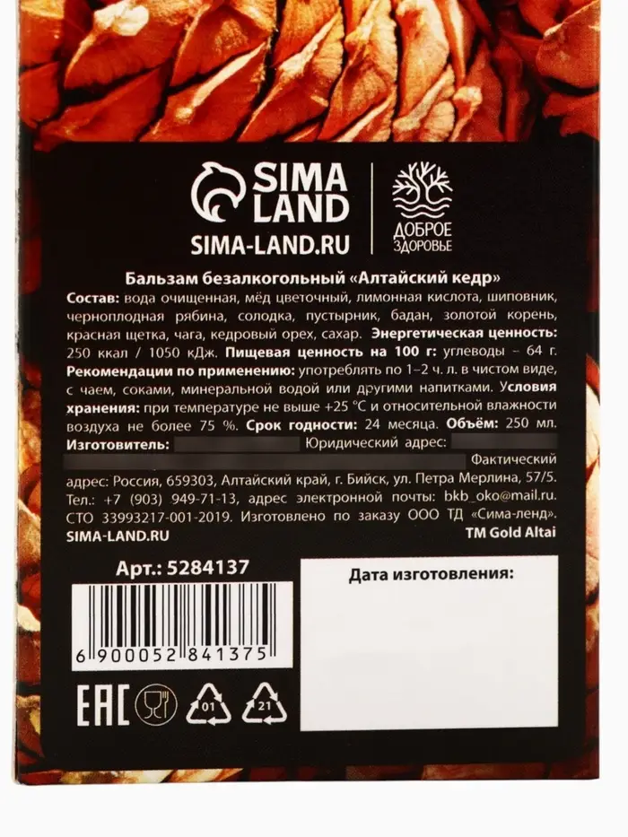 Бальзам безалкогольный «С кедровым орехом», 250 мл