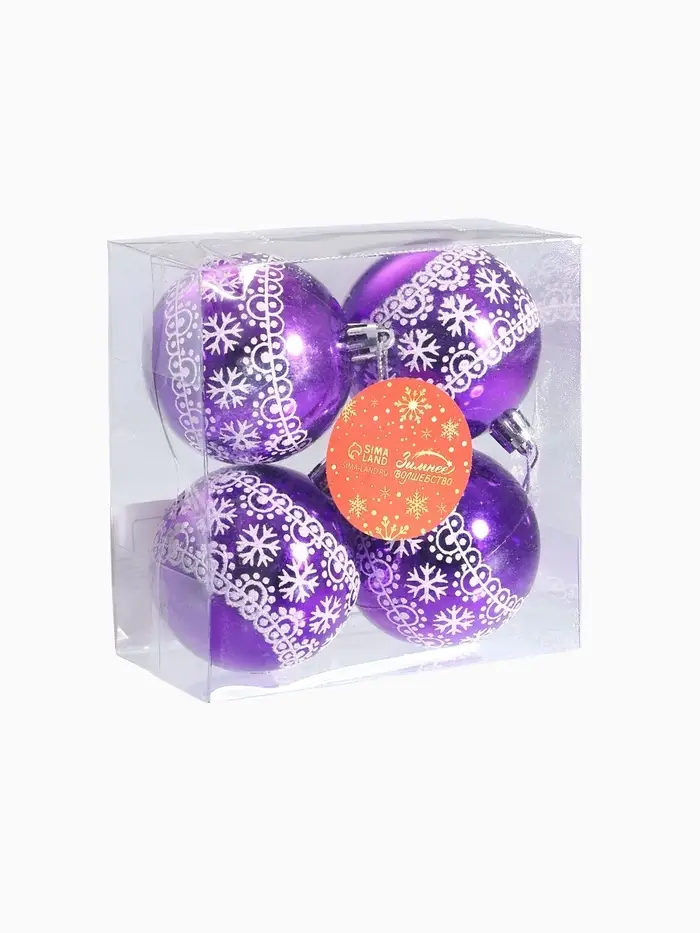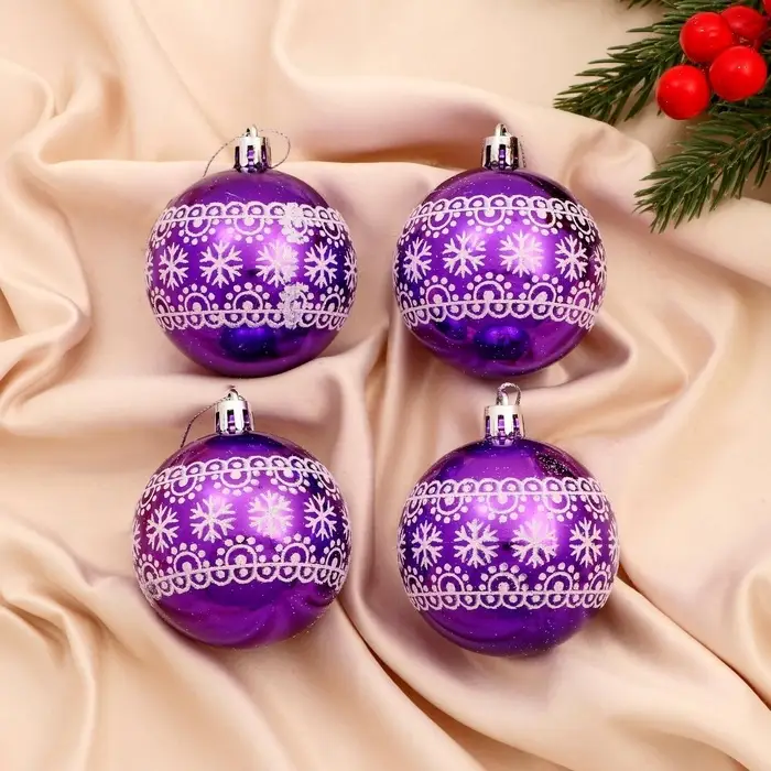 Набор из четырёх новогодних шаров диаметром 6 см сочетает в себе элементы советского дизайна и фьюжн-стиля в бело-фиолетовой гамме с изящными рисунками. Эти украшения придают ёлке особый характер, подчёркивая праздничную атмосферу и уникальность декора.