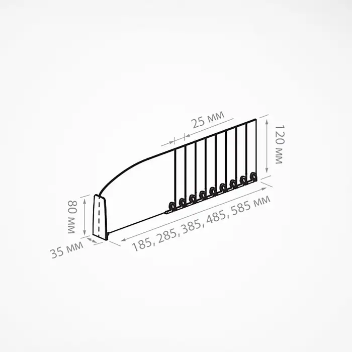 - Длина разделителя изменяется от 18.5 до 38.5 см, позволяя подбирать оптимальную ширину секции для конкретных товаров и типов полок;