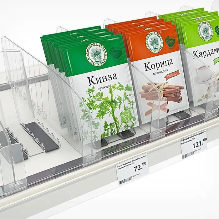 Используйте данный разделитель в торговле продуктами питания, канцелярией и другими категориями товаров, где важна четкая организация пространства и привлекательность товарного ряда.