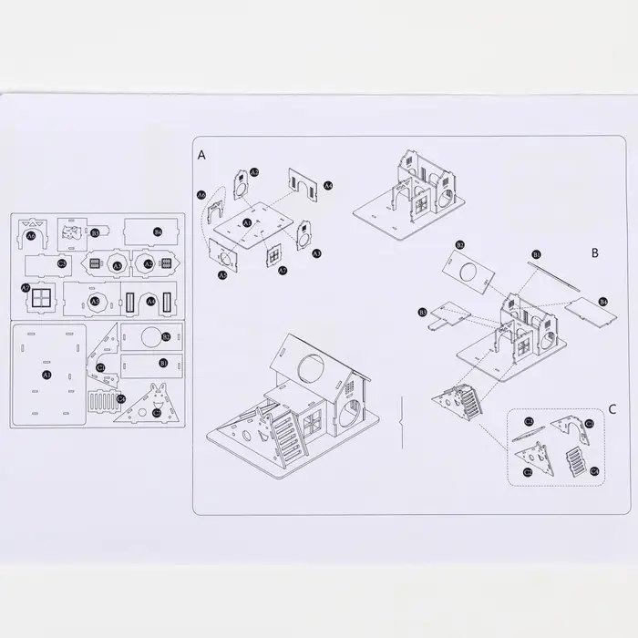 - Два домика + горка: питомец может прятаться, бегать по тоннелю и скатываться по горке — это стимулирует естественное поведение и снижает скуку.