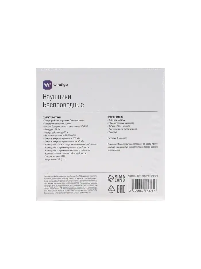 Наушники беспроводные Windigo W22, TWS, вкладыши, Bluetooth 5.0, 40/500 мАч, сенсор, белые глянцевые