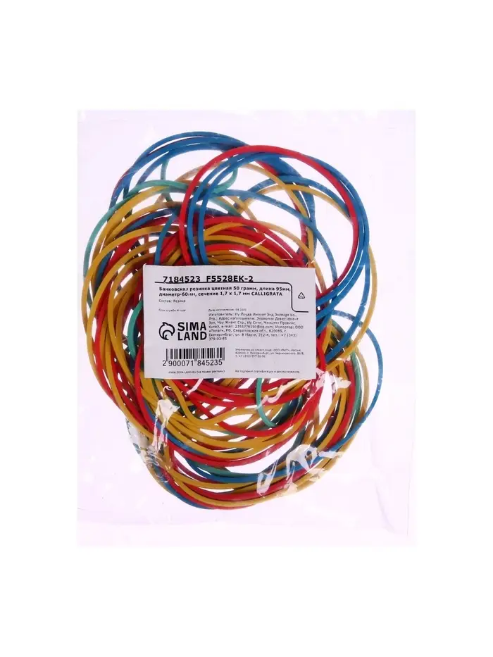 Банковская резинка, 50 г, диаметр 60 мм, длина 95 мм, сечение 1.7×1.7 мм, МИКС, в пакете