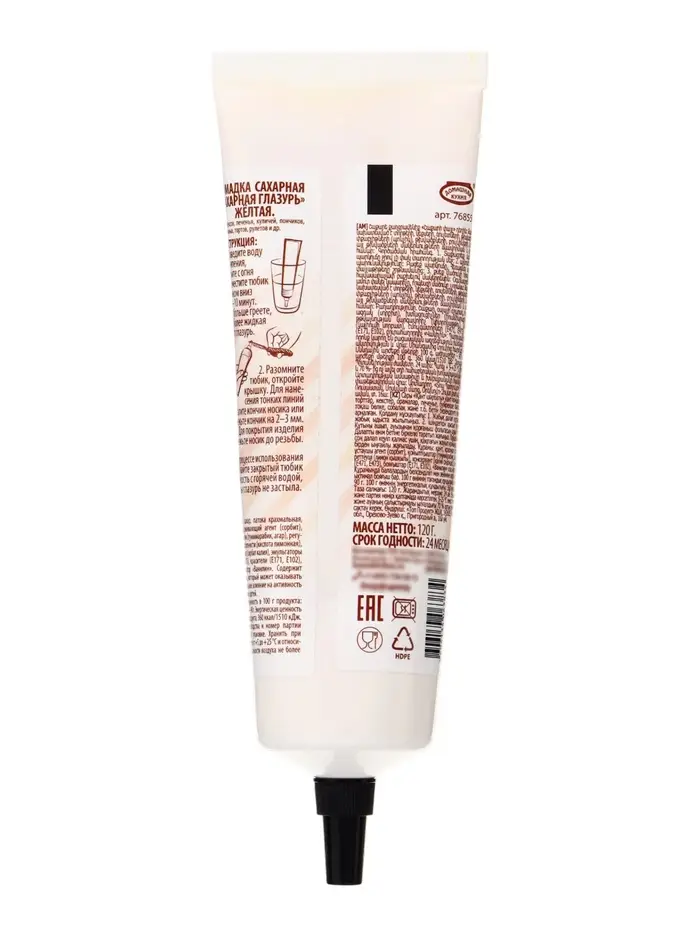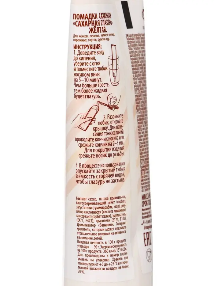 Описание: помадка сахарная ПАРФЭ Декор, желтая предназначена для украшения выпечки. Она отличается красивым насыщенным оттенком, чистота цвета которого достигается за счет специальной технологии. Насыщенный раствор сахара нагревается до температуры кипения, а затем мгновенно охлаждается, благодаря он быстро кристаллизуется. Отражая свет, микрокристаллы создают идеальный глянцевый блеск, достичь которого в домашних условиях очень сложно. Помадка удобно и легко наносится прямо из тюбика. Для рисования тонкими линиями нужно просто проколоть защитную фольгу зубочисткой.
