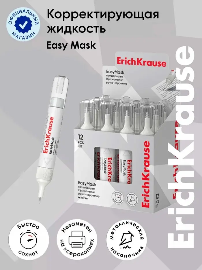 Ручка-корректор с быстросохнущей корректирующей жидкостью для точечных исправлений. Показывает отличный результат на всех типах и цветах чернил. Высококачественный металлический наконечник обеспечивает плавное движение и экономичный расход. Жидкость удобно наносить локально на необходимый фрагмент, создавая непрозрачный слой, незаметный на ксерокопиях. Морозостойкая. На основе растворителя. Перед применением жидкость необходимо взболтать с помощью внутреннего металлического шарика.