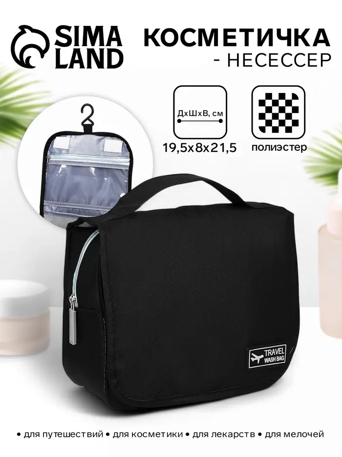 Косметичка-несессер дорожная на молнии, липучках, с крючком, чёрная