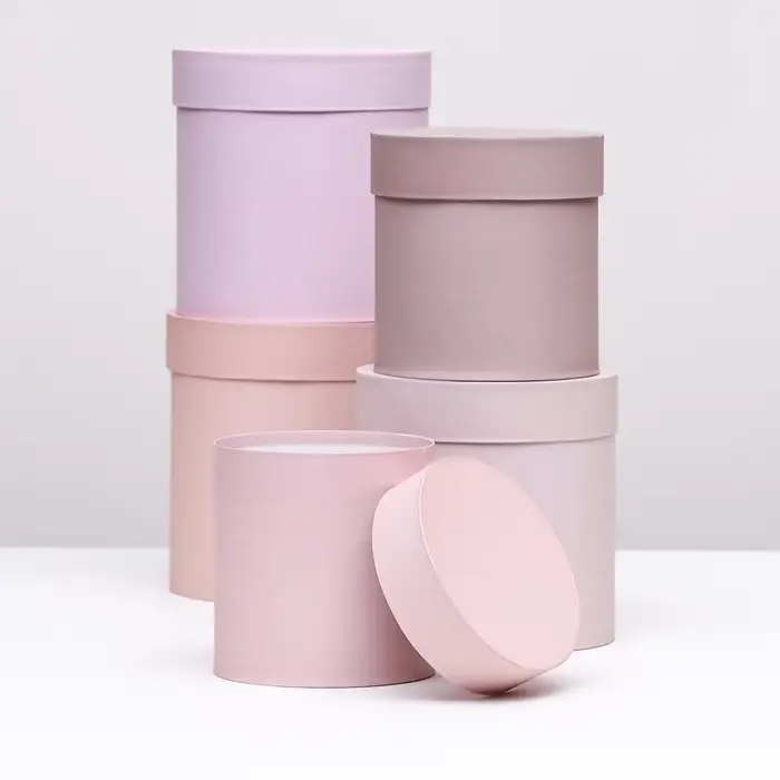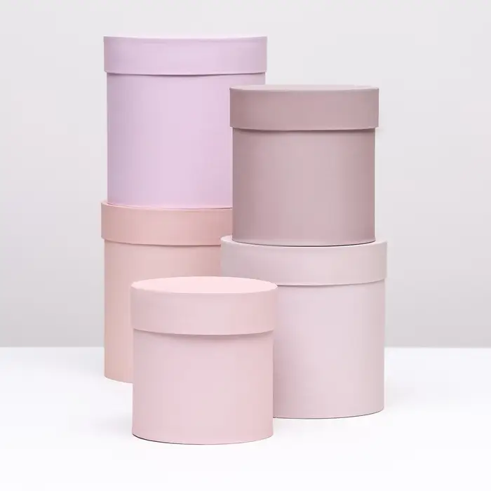- Пять шляпных коробок разного диаметра: Классическая форма с высотой, равной диаметру (от 20 см до 13.5 см), создаёт устойчивый и элегантный силуэт. Такие пропорции подходят для упаковки объёмных, но не плоских предметов: косметических наборов, текстиля, небольших мягких игрушек, парфюмерии или подарочных изданий.