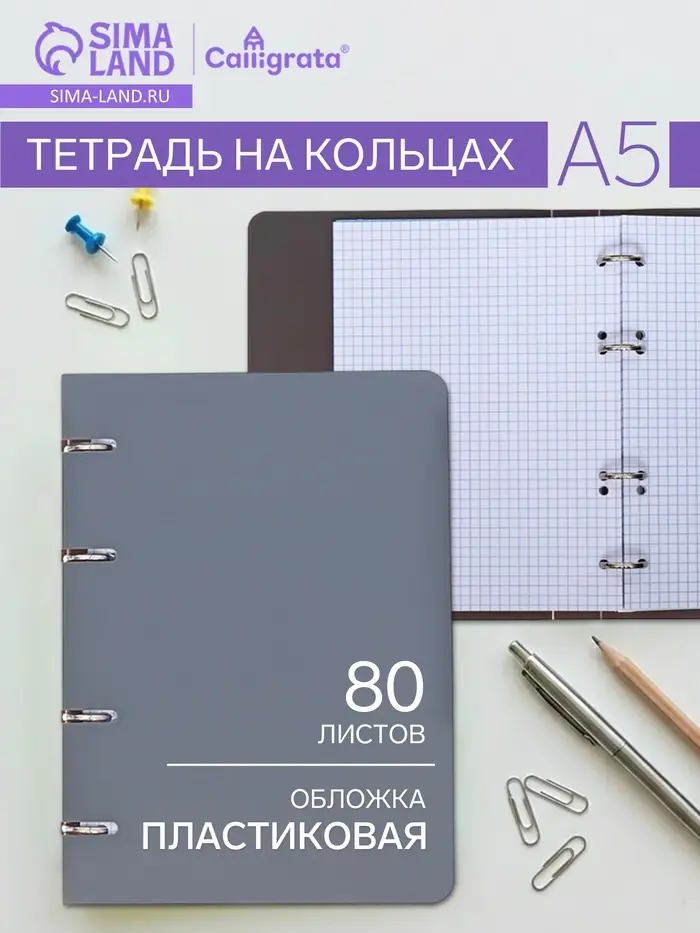 Тетрадь на кольцах Calligrata A5, 80 листов, в клетку, пластиковая обложка, блок офсет, серая