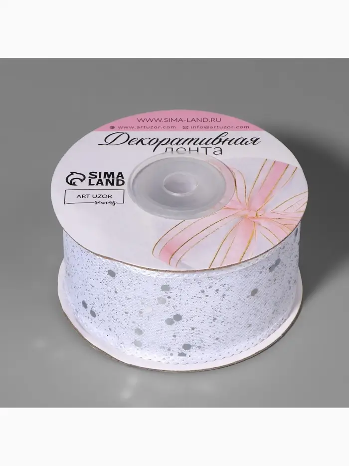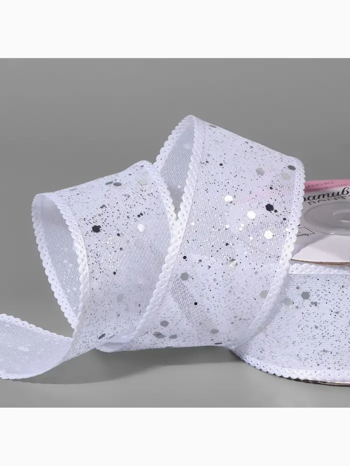 Лента декоративная, с глиттером, 38 мм, 9±0.5 м, белая, серебряная