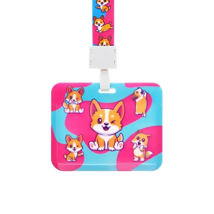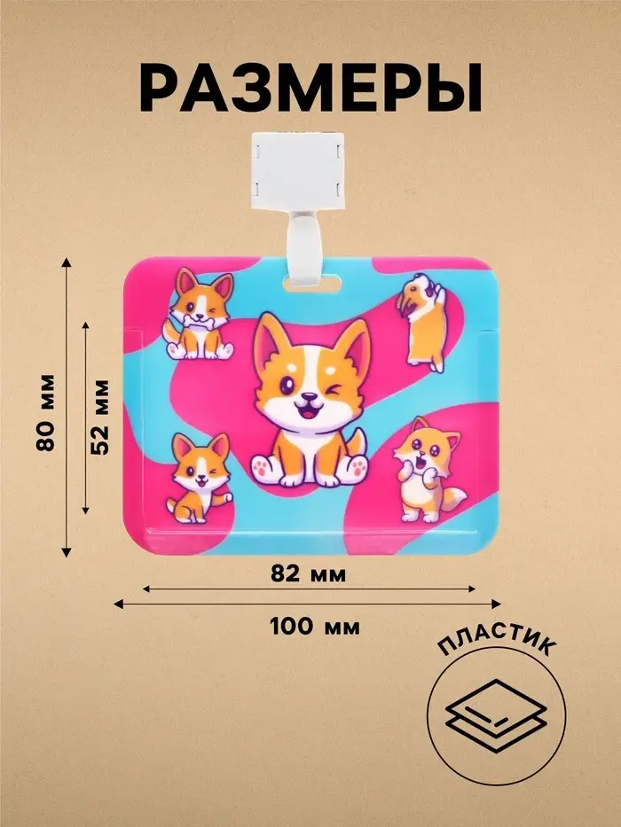 Горизонтальный бейдж с очаровательным принтом корги — стильное и удобное решение для мероприятий, офиса или учёбы. Выполнен из прозрачного пластика, который защищает вставку от повреждений и загрязнений. Внешний размер 100×80 мм, внутренний — 52×82 мм, что позволяет легко вставлять и менять карточки. Лента длиной 42 см комфортно располагается на шее, не натирая кожу. Прочный, долговечный и легкий — он идеален для идентификации на конференциях, выставках и в повседневной работе.