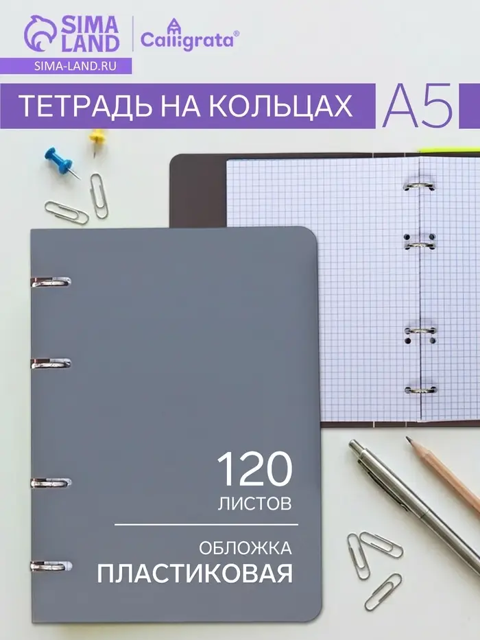 Тетрадь на кольцах Calligrata A5, 120 листов, в клетку, пластиковая обложка, блок офсет, серая