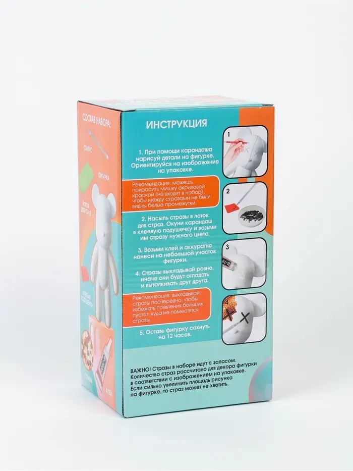 Набор позволит ребёнку смастерить сверкающую игрушку. Малыш с интересом создаст шедевр из ярких страз. Ему понравится не только результат работы, но и сам творческий процесс. Увлекательное занятие поможет развить мелкую моторику рук, усидчивость, внимательность и аккуратность.
