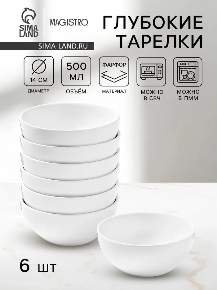 Тарелки глубокие Magistro Mien, 500 мл, d=14 см, набор 6 шт., фарфор, белые