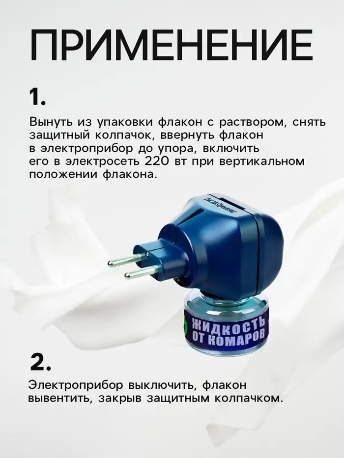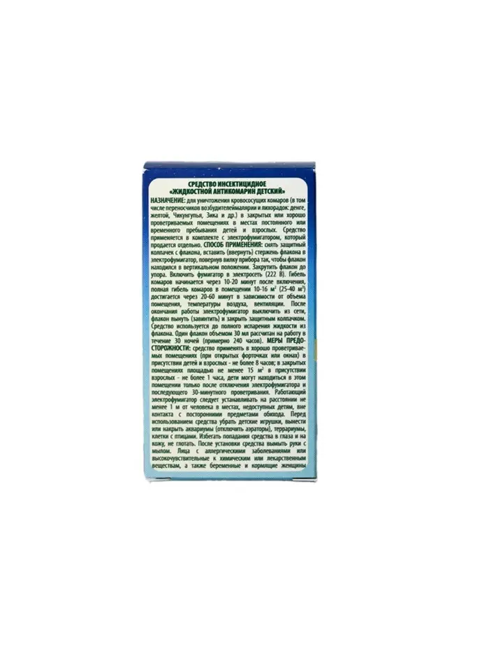 Описание: инсиктицидное средство от комаров.Назначение: для уничтожения комаров в помещениях.Меры предосторожности: использовать только по назначению. Применять в хорошо проветриваемых помещениях площадью не менее 13 м2 при открытых окнах (форточках). Не использовать одновременно флакон с жидкостью и пластины в одном электрофумигаторе. Флакон запрещается разбирать и давать детям.Состав: ДВ - праллетрин - 0,7 %, стабилизатор, растворитель (жидкий парафин).Срок годности: 48 месяцев.
