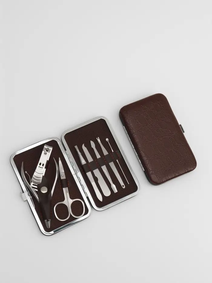 Маникюрный набор «Рептилия» в коричневом футляре — это 8 профессиональных инструментов для ухода за руками и ногтями. Стильный кейс с текстурой кожи рептилии сочетает практичность и оригинальный дизайн.