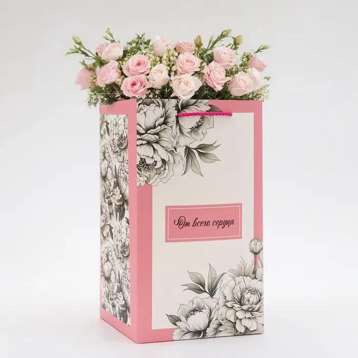 - Удобные шнуры-ручки: Позволяют комфортно переносить букет. Не врезаются в руки и выдерживают вес полноценной цветочной композиции.