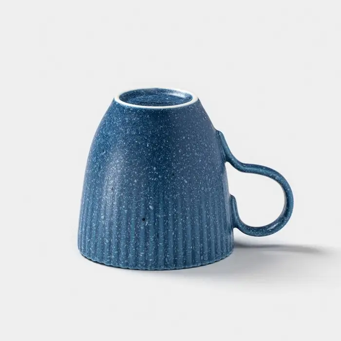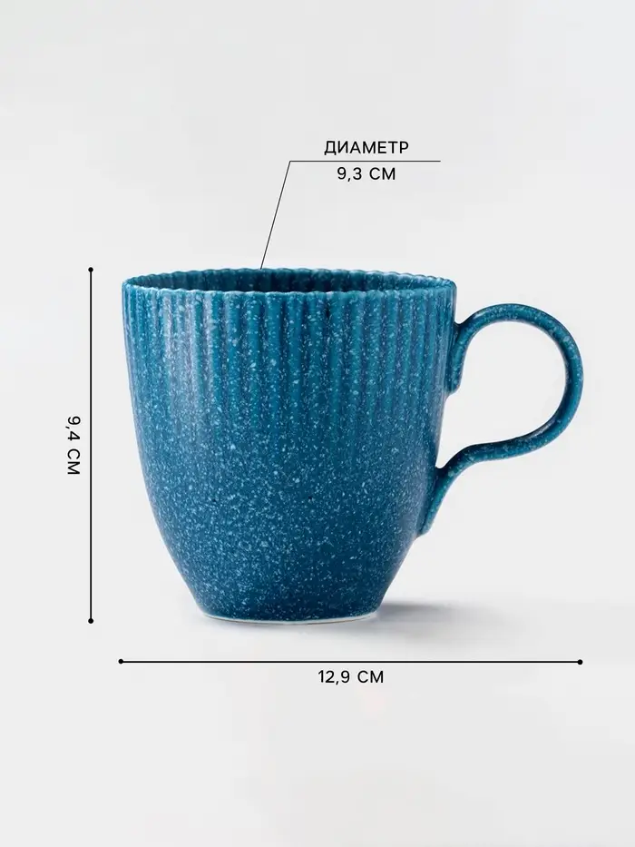 - Стильный акцент: насыщенный синий цвет и рельефная текстура делают кружку не просто привычным предметом, а эффектным элементом сервировки стола.