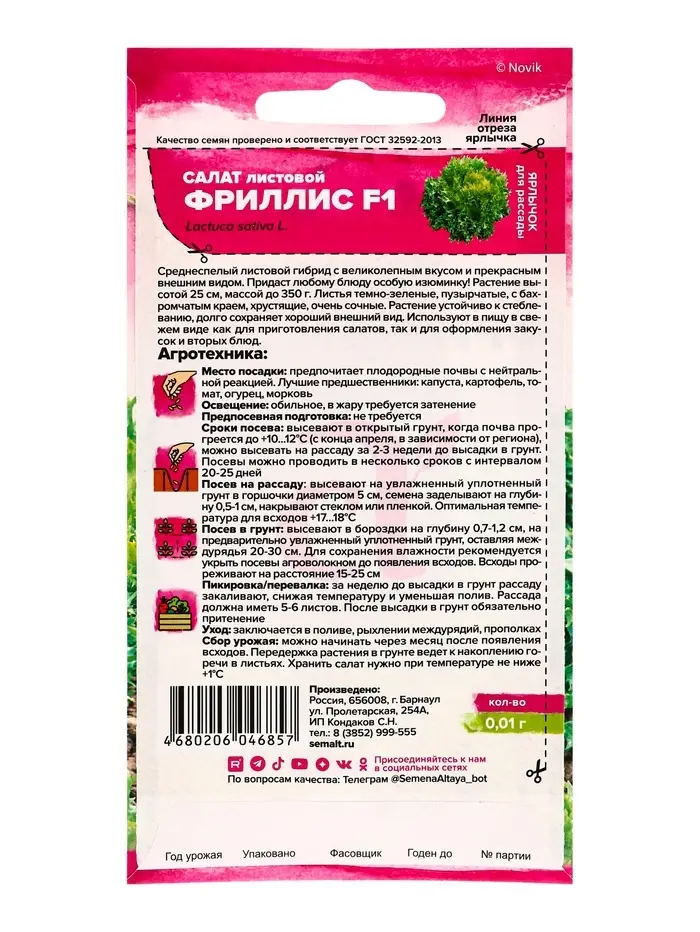 Среднеспелый листовой сорт с великолепным вкусом и прекрасным внешним видом. Придаст любому блюду особую изюминку! Растение высотой 25 см, массой до 350 г. Листья темно-зеленые, пузырчатые, сильноволнистые по краю, являются прекрасным украшением. Листья хрустящие, очень сочные. Растение устойчиво к стеблеванию, долго сохраняет хороший внешний вид. Используют в пищу в свежем виде, как для приготовления салатов, так и для оформления закусок и вторых блюд. Холодостойкое растение. Влаголюбив. Предпочитает плодородные почвы с нейтральной реакцией. Грядка должна быть на солнечном или слегка притененном месте. Лучшие предшественники — капуста, картофель, томат, огурец, корнеплоды. Салат можно выращивать как в открытом, так и защищенном грунте. В открытый грунт семена высевают в самые ранние сроки, как только позволит почва. Глубина заделки 1-1,5 см. Дальнейшие посевы проводят с интервалом в 15 дней. Посадочный интервал 20х15 см. Сбор урожая обычно проводят утром, выдергивая растения с корн